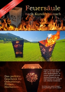 Unsere Feuersäule hat vier Füße und an allen Seiten unten Belüftungslöcher. Im Inneren befindet sich eine Ascheauffangwanne aus Edelstahlblech mit Handgriff zum einfachen Entnehmen.